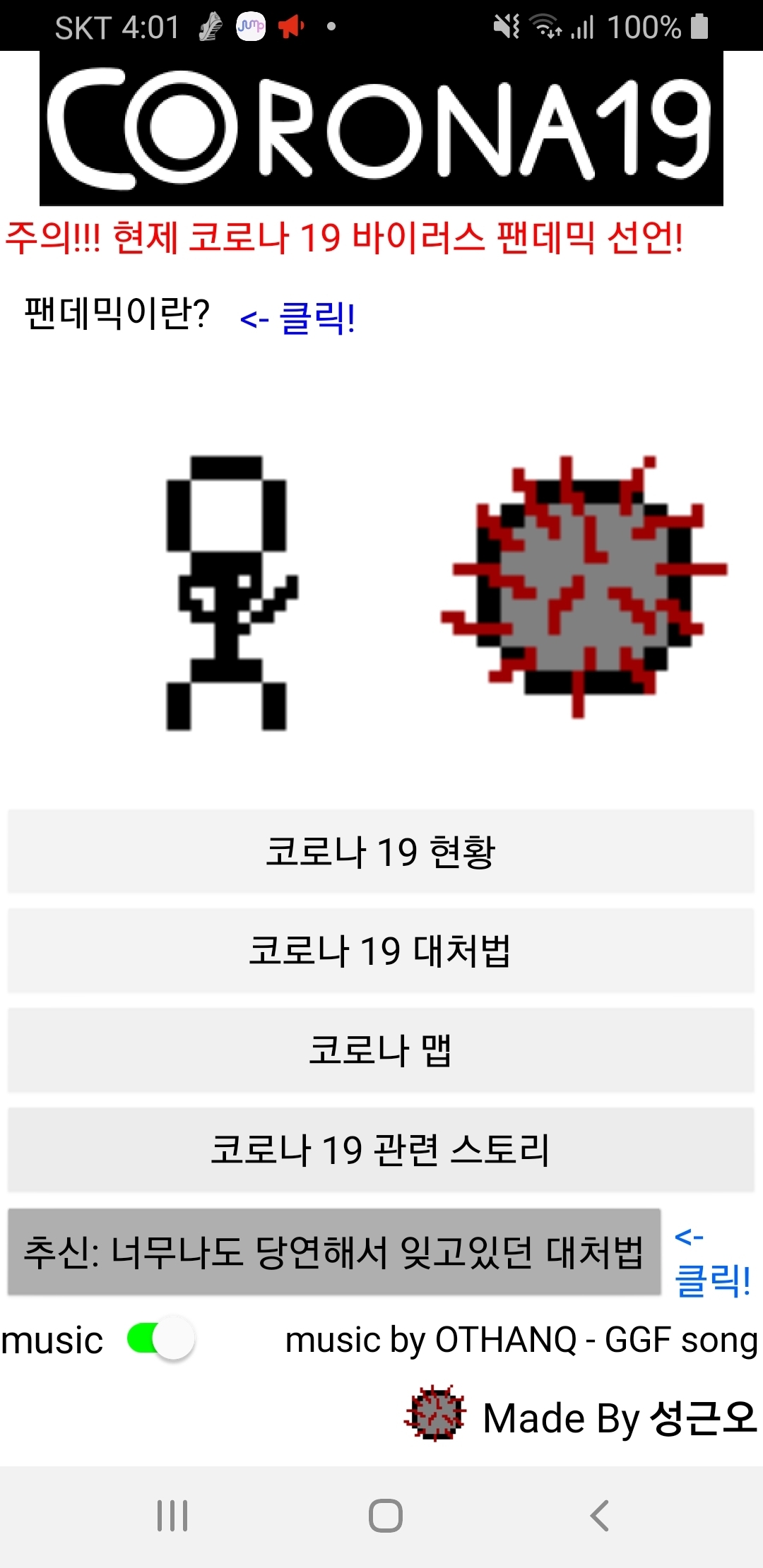 MIT app inventor로 만들었습니다. 주로 웹뷰어를 사용하여 코로나19 감염자 현황, 관련 영상 등을 보여줍니다. 비디오 플레이어로 손을 제대로 씻는 법을 영상을 보도록 했습니다. 이미지들은 도트 아트 프로그램인 aseprite와 스크래치의 이미지 에디터를 사용하여 직접 그렸습니다.