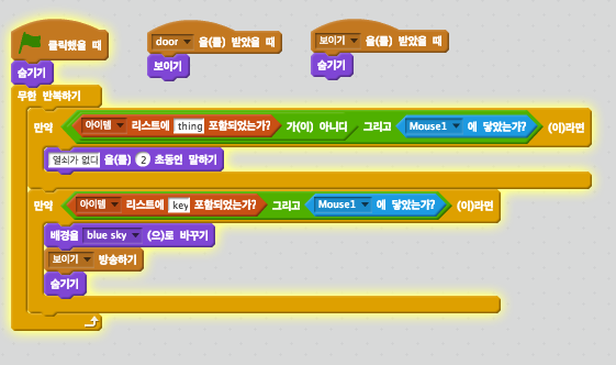 리스트를 이용해서 황금 열쇠를 습득 했을 때에만 문이 열리도록 했습니다.