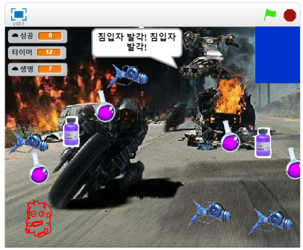 게임이 시작한지 12초가 지나면 광선총의 작동이 시작됩니다. 광선총은 빨간 바보에게 피해는 가지 않지만, 1번, 2번 터미네이터에겐 시스템 오류를 줍니다. 따라서 파란 포털에 들어가면 성공 입니다.