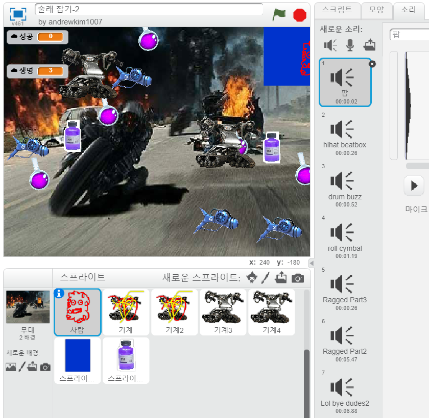 제가 좋아하는 이미지와 사운드를 이용하여 술래잡기 게임을 만들었습니다.