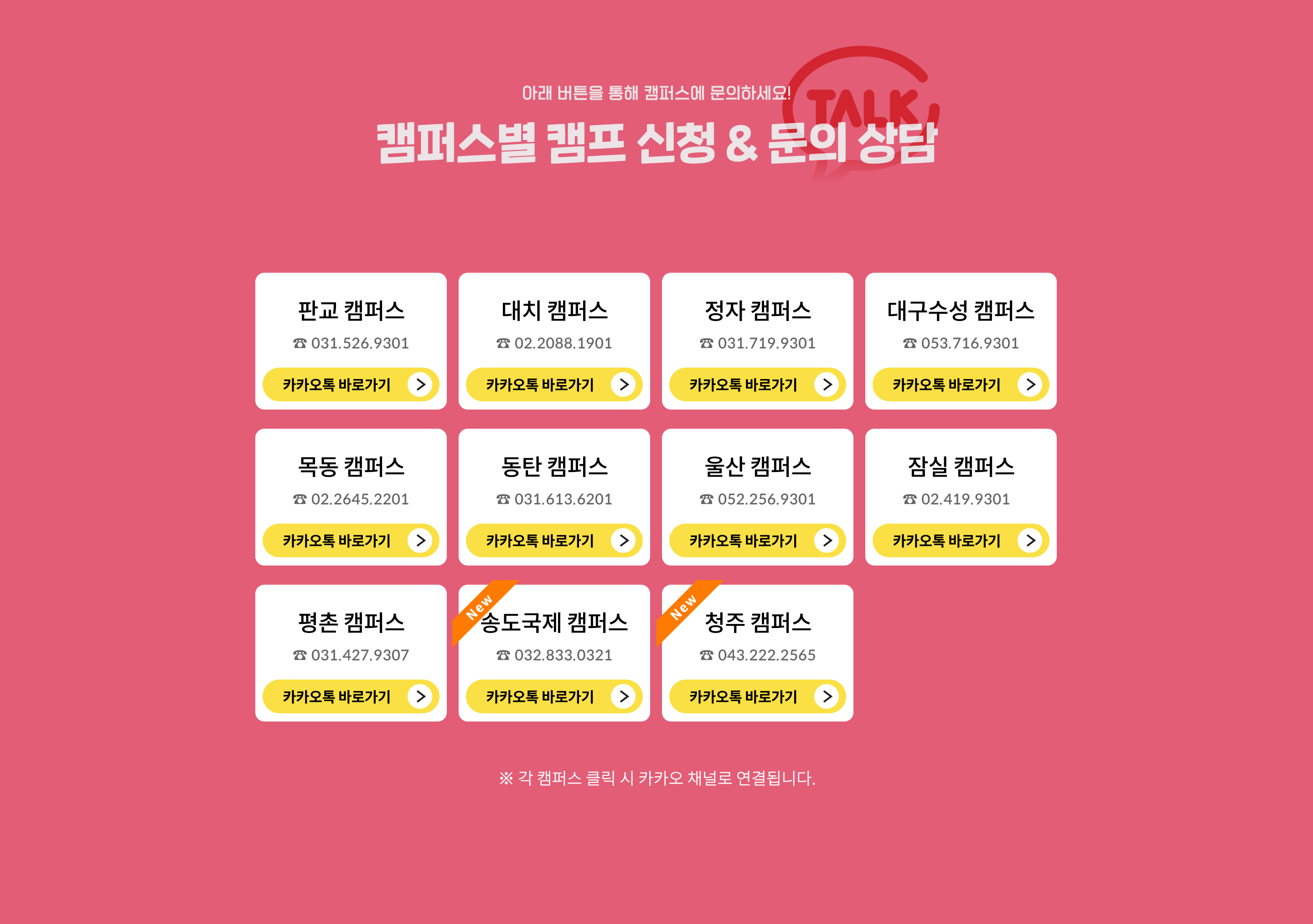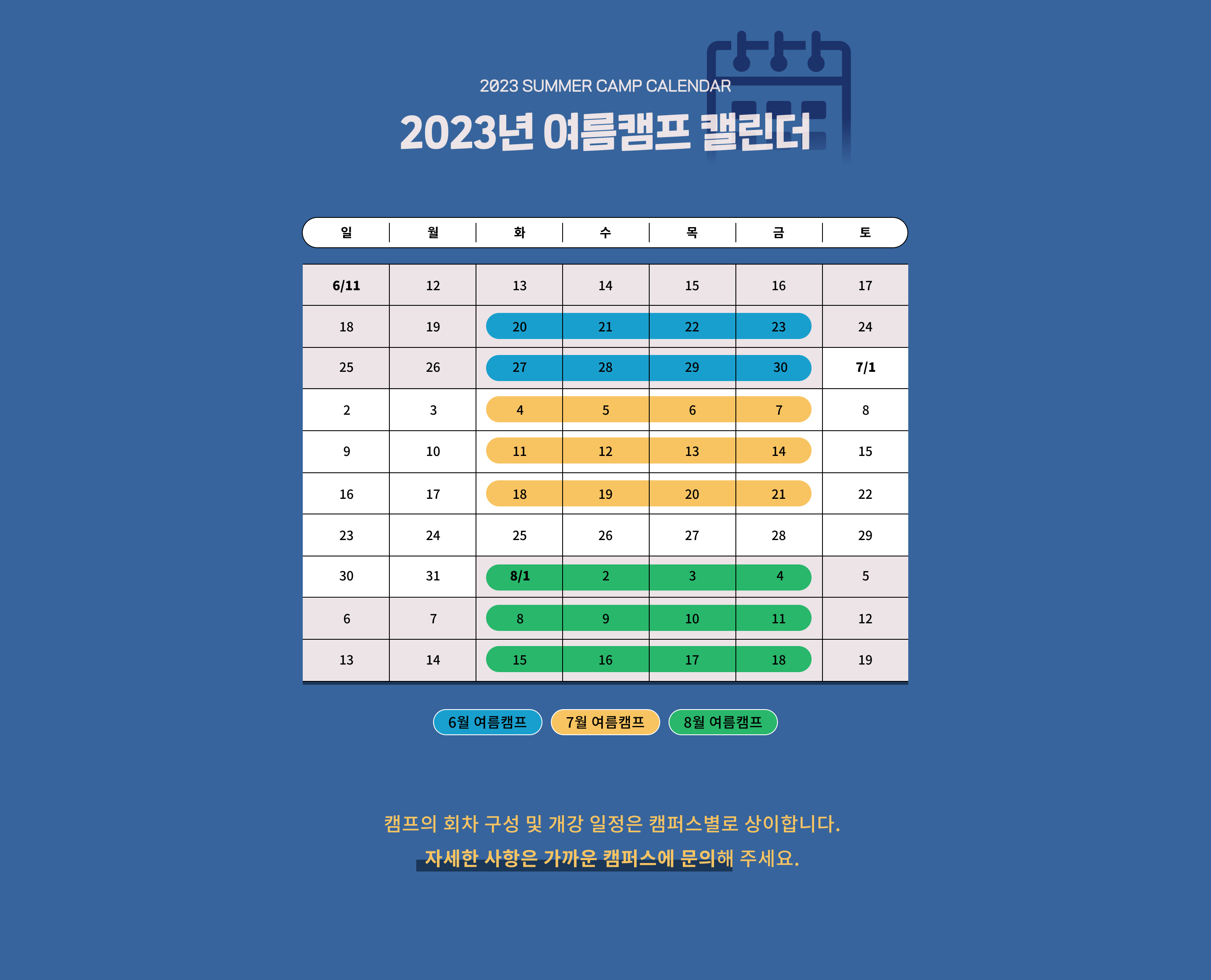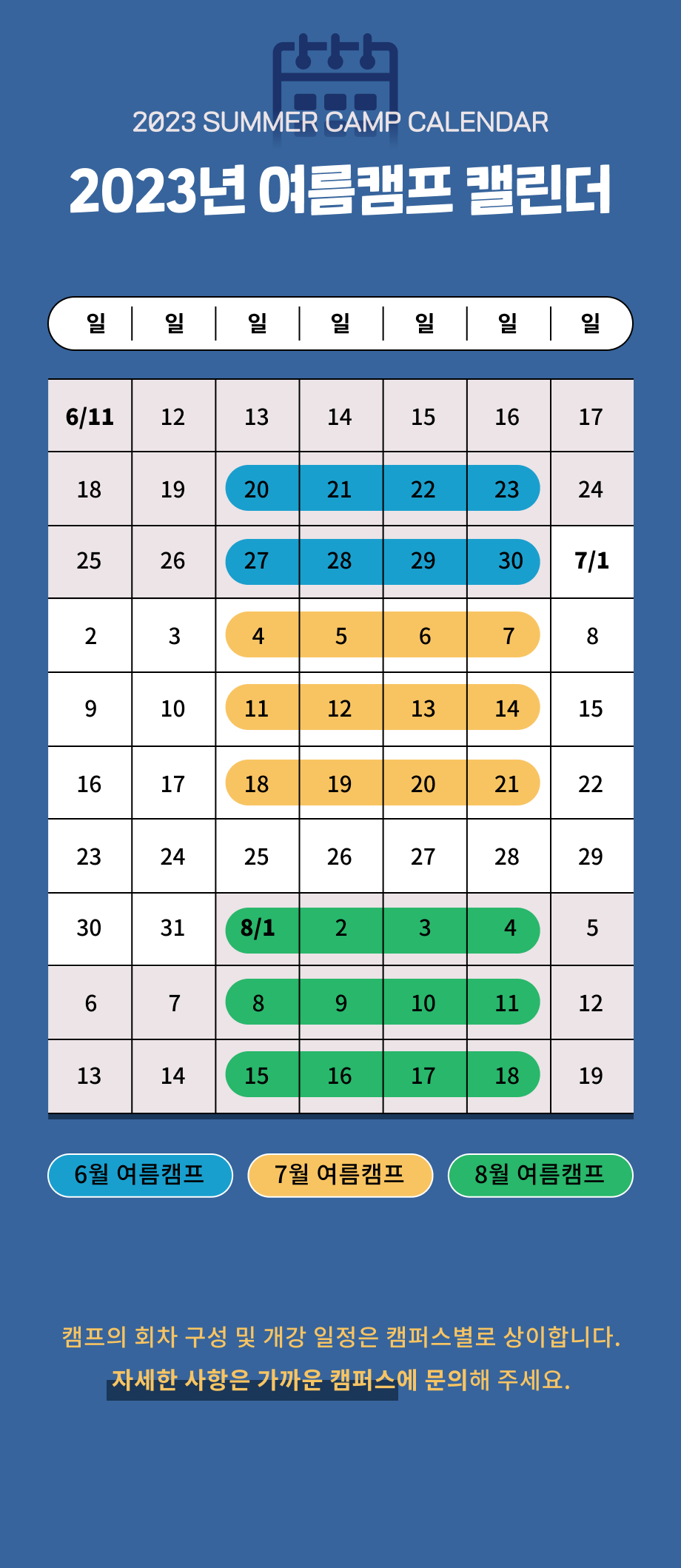 여름캠프캘린더 캠퍼스별문의